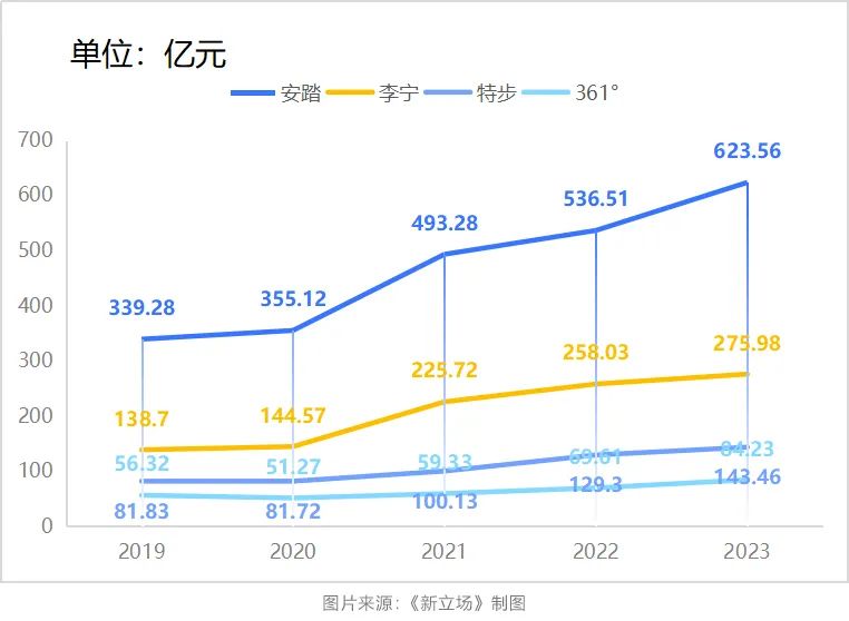 目前,国内主要的体育服饰品牌如安踏、李宁、特步、361度等均已发布了2023年的业绩报告,整体上呈现持续增长的态势,但增长速度各有差异。其中,安踏的表现尤为突出。