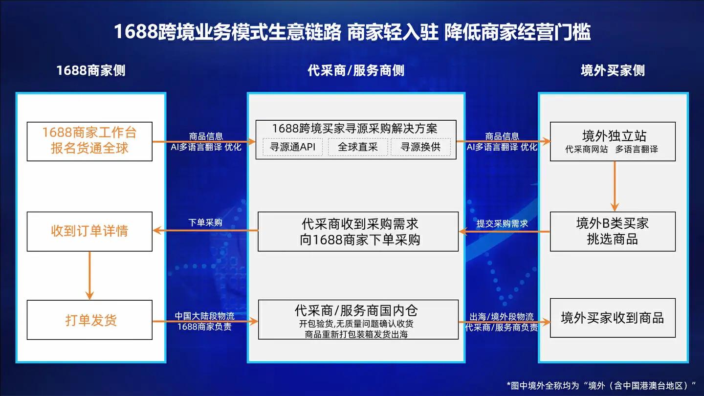 先来看整体的经营链路,据 1688 官方介绍,商家报名入驻 1688 货通全球后,商品会通过 API 接口展示在海外独立站;海外买家产生采购需求后由代采商统一下单;商家在后台根据订单信息打单发货将商品发往代采商国内仓;后续集货、贴标、装箱、出海等流程和费用均由代采服务商完成。