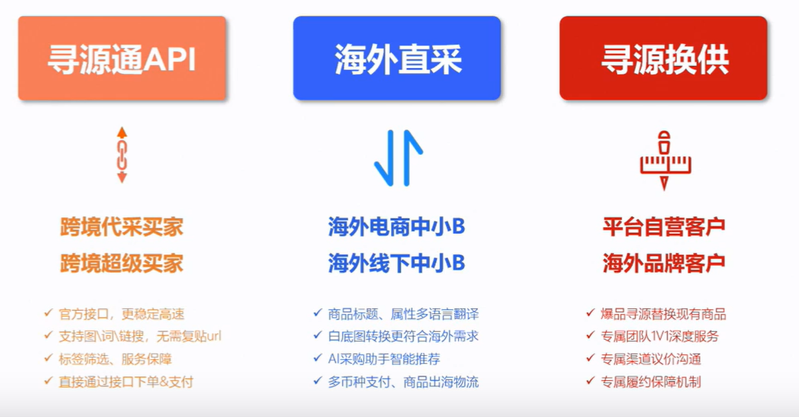 虽然早有涉及跨境交易,但 1688 全面升级跨境业务是在去年底,以“寻源通”计划的发布为标志,主要包含两方面举措。一是提供跨境版 API 接口,允许合作伙伴将 1688 的货盘铺向全球,增加销售渠道;二是提供 AI 技术,通过图/词/链接搜索功能,帮助用户快速完成比价、选品等流程。