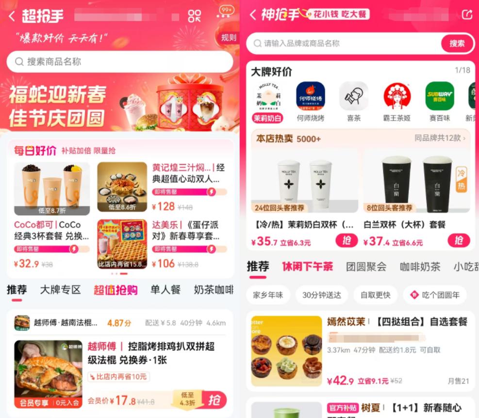 基于以上背景,饿了么于去年末上线了“超抢手”低价频道,占据 App 首页最醒目的推荐位,主打“爆款好价”。在低客单价、高复购率的消费场域,“弱化品牌、突出平台”,以单个爆款 SKU 冲击更大的流量曝光,这种模式带有一定拼多多“风格”。