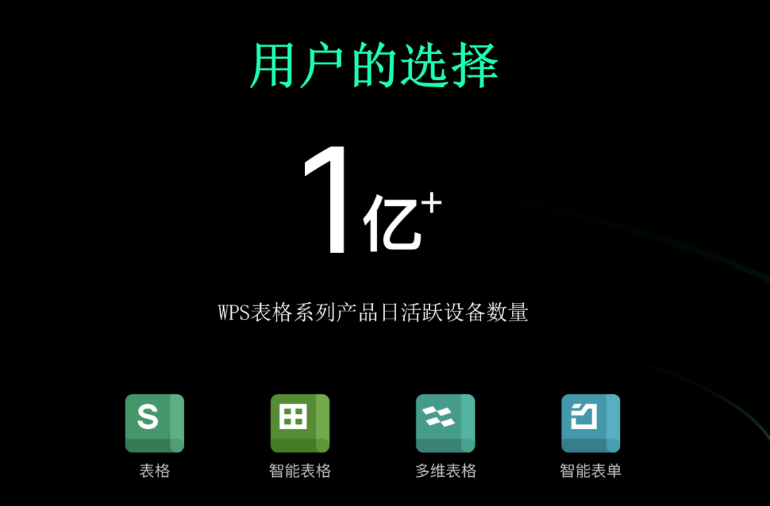 随着赛道升温,市场教育初步完成。金山办公也将旗下已投入深度研发多时的WPS多维表格推向台前,进行正式的品牌亮相。作为 WPS 的核心组件,经过三十多年迭代积累,其表格系列产品日活设备数已突破 1 亿。