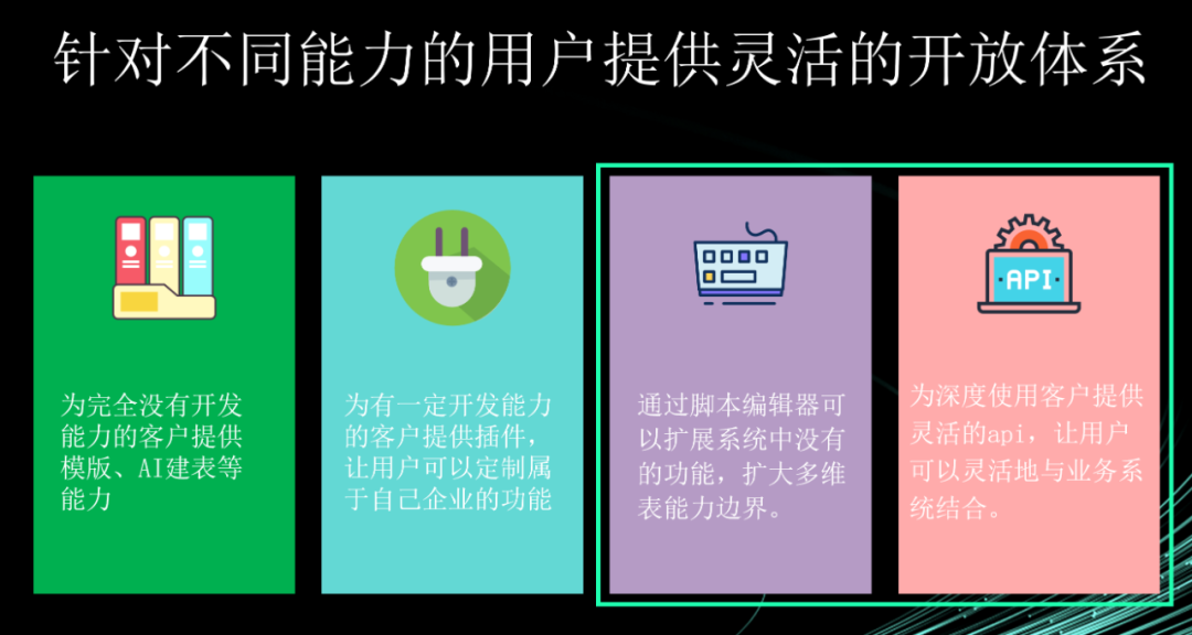 这套体系被概括为“四级开放”:从即取即用的模板,到可定制企业专属功能的插件,再到实现复杂逻辑的脚本编辑器,直至与核心业务系统深度集成的API。借此可以看到一条清晰的“能力上升曲线”,旨在覆盖从普通业务人员到专业开发者的全光谱用户。