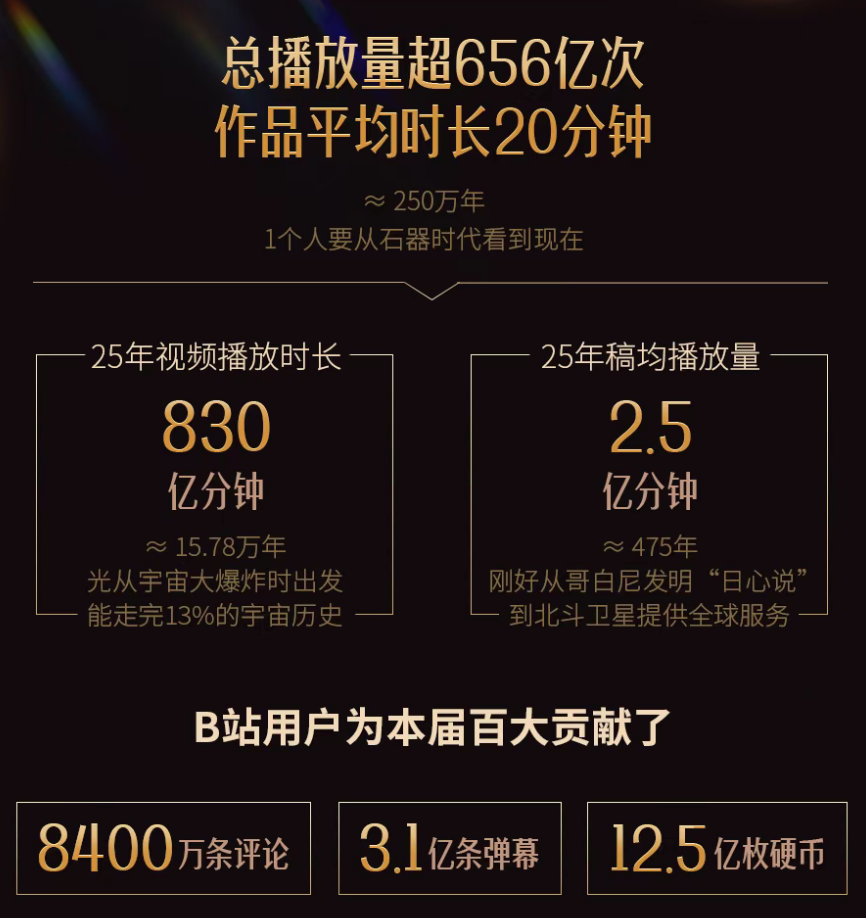 近几年的 B 站也在主动围绕百大做品牌化叙事。比如从去年开始入选 UP 主都是横屏长视频创作者,今年公布的数据特别提到,超 6 成百大连续创作 5 年以上,其中 18 位UP主已超过 10 年,更新时间最长的 2 名 UP 主更是达到了 15 年。这都是强调其内容环境专业、稳定、有影响力。
