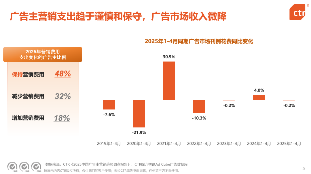 CTR 媒介智讯 Ad Cube 截至去年 4 月的数据是,广告市场同比微降 0.2%,整体趋于保守和稳定。