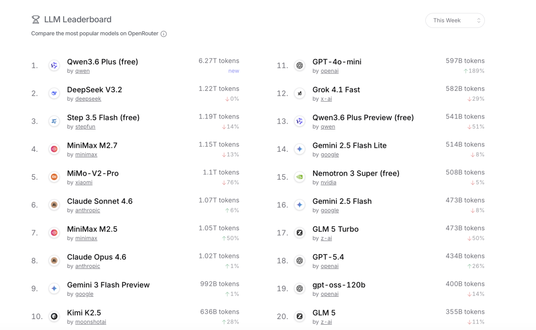 2026年初,中国大模型行业的Token调用量出现了一次断层式跃升。OpenRouter数据显示,三月初,中国大模型周调用量达到4.69万亿Token,连续两周超越美国,全球排名前五均为国产模型。驱动这一跃升的,是以OpenClaw为代表的Agentic编程工具链的大规模普及。