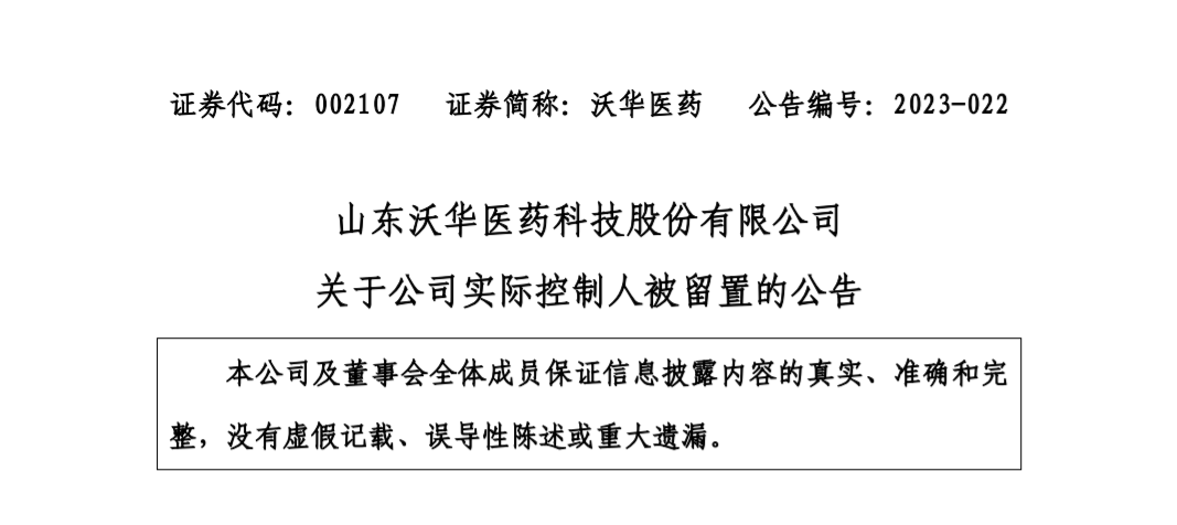 灯塔媒介11月7日讯,沃华医药(002107)11月6日晚发布公告,确认其董事长、实际控制人赵丙贤近期被采取留置措施,以配合监委机关的调查。