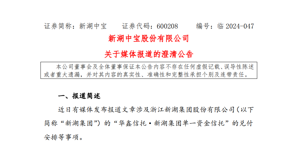 灯塔媒介6月28日讯,新湖中宝(600208)今日午间发布一份澄清公告,回应了近日有媒体报道涉及浙江新湖集团股份有限公司(以下简称“新湖集团”)的“华鑫信托·新湖集团单一资金信托”的兑付安排等事项。