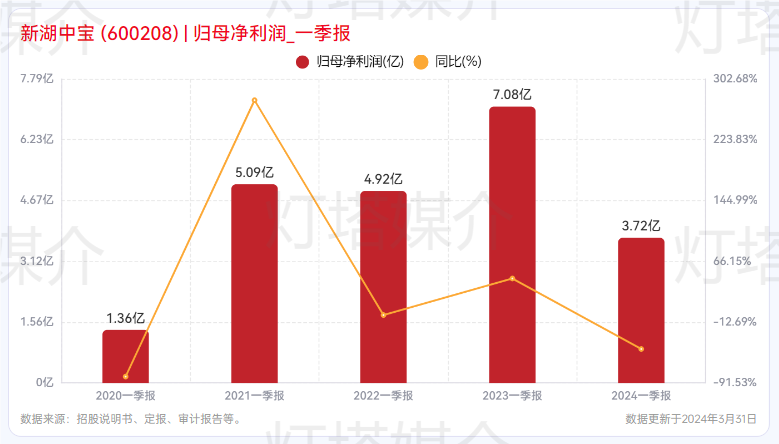 2024年一季度,新湖中宝实现营业收入22.43亿元,同比增长610.24%;归母净利润3.72亿元,同比下降47.45%;扣非净利润8.59亿元,同比增长51.17%。