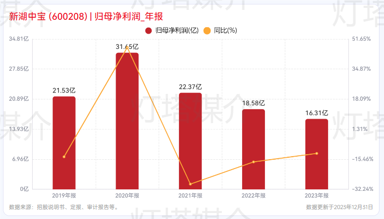 业绩方面,2023年,新湖中宝实现营业收入172.1亿元,同比增长33.42%;实现净利润22.20亿元,同比增长24.89%;归属于上市公司股东的净利润16.31亿元,同比下降12.19%,主要系公司遵循谨慎性原则,对部分开发项目和部分投资项目计提了减值准备14.86亿元。