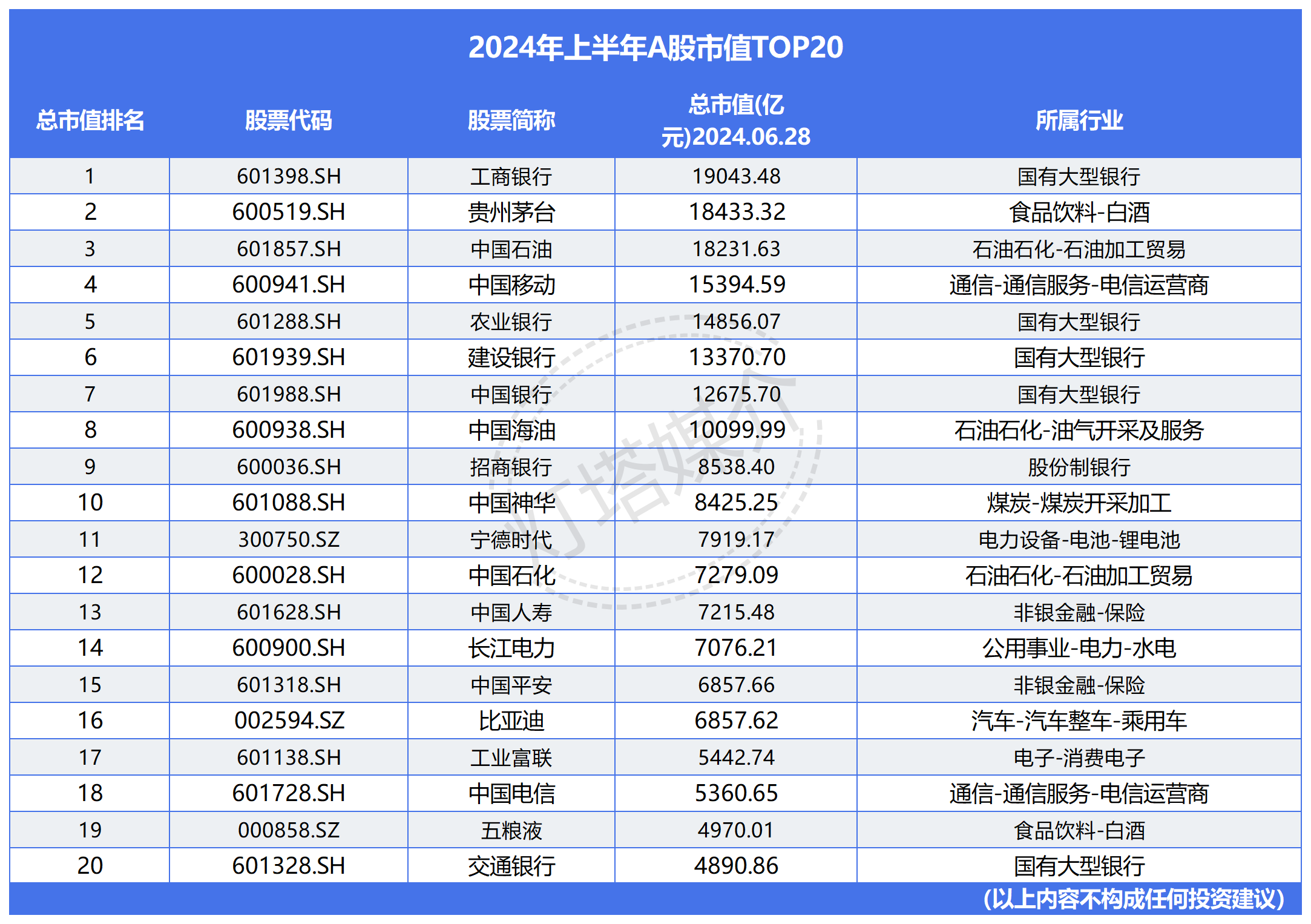 盘点! 2024年上半年A股市场市值分析!市值TOP20名单