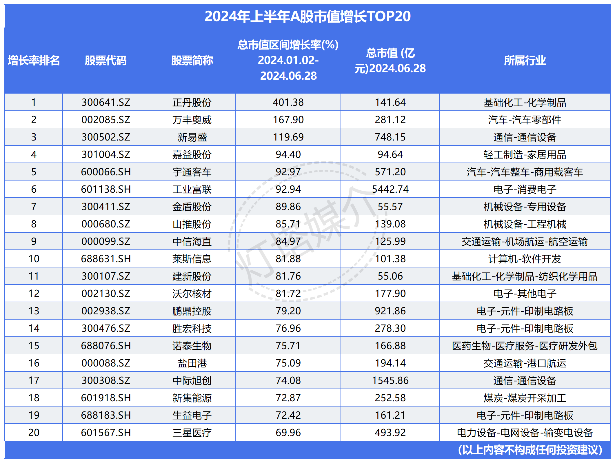 在市值增长方面,正丹股份(300641)以惊人的401.38%增幅成为2024年上半年A股市场的“第一牛股”。