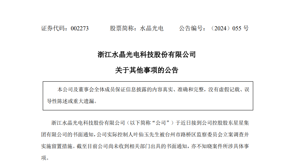 灯塔媒介7月12日讯,水晶光电(002273)7月11日晚间发布公告,其控股股东星星集团有限公司(简称“星星集团”)书面通知称,公司实际控制人叶仙玉被台州市路桥区监察委员会立案调查并实施留置措施。这一消息在资本市场引发了剧烈波动。
