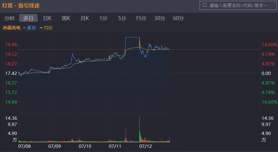 而就在前一天,7月11日,水晶光电的股价直线拉升至涨停,以20.60元/股的价格收盘,创造了上市以来的新高,公司市值一度飙升至286亿元。