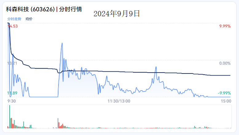 9月9日开盘时,科森科技的股价一度触及涨停,但好景不长,短短几分钟内,股价便直线跳水,最终以大跌收盘。截至当日收盘,科森科技的股价报11.89元/股,总市值65.98亿元。