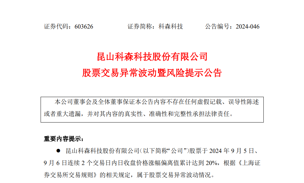 面对股价的异常波动,科森科技在9月6日晚间发布了股票交易异常波动暨风险提示公告。