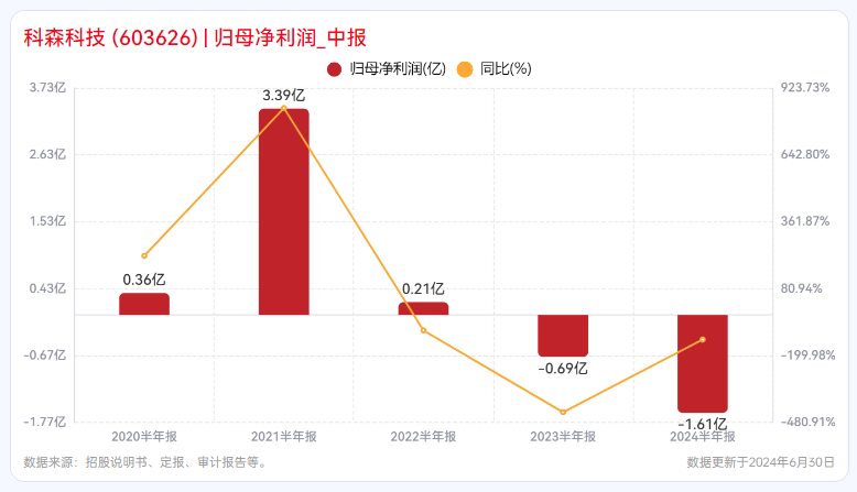 业绩数据显示,2024年上半年,科森科技实现营业总收入17.41亿元,同比增长35.62%,但净利润却为负1.61亿元,同比下降132.13%。公司的亏损可能与其在新业务领域的投入增加、市场竞争加剧以及原材料成本上升等因素有关。