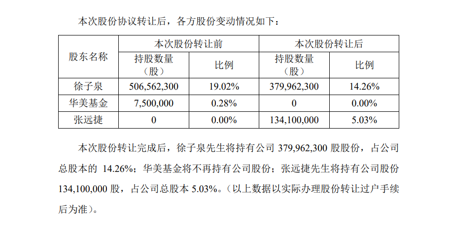转让完成后,徐子泉仍持有公司总股本14.26%的股权,仍为公司控股股东和实际控制人;华美基金将不再持有公司股份;张远捷将持有公司总股本5.03%的股权。