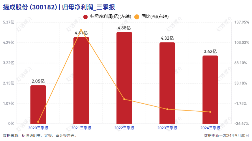 2024年前三季度,捷成股份实现营收21.31亿元,净利润3.62亿元、同比下降16.21%。尽管如此,今年第三季度单季的净利润却同比增长了40.65%。