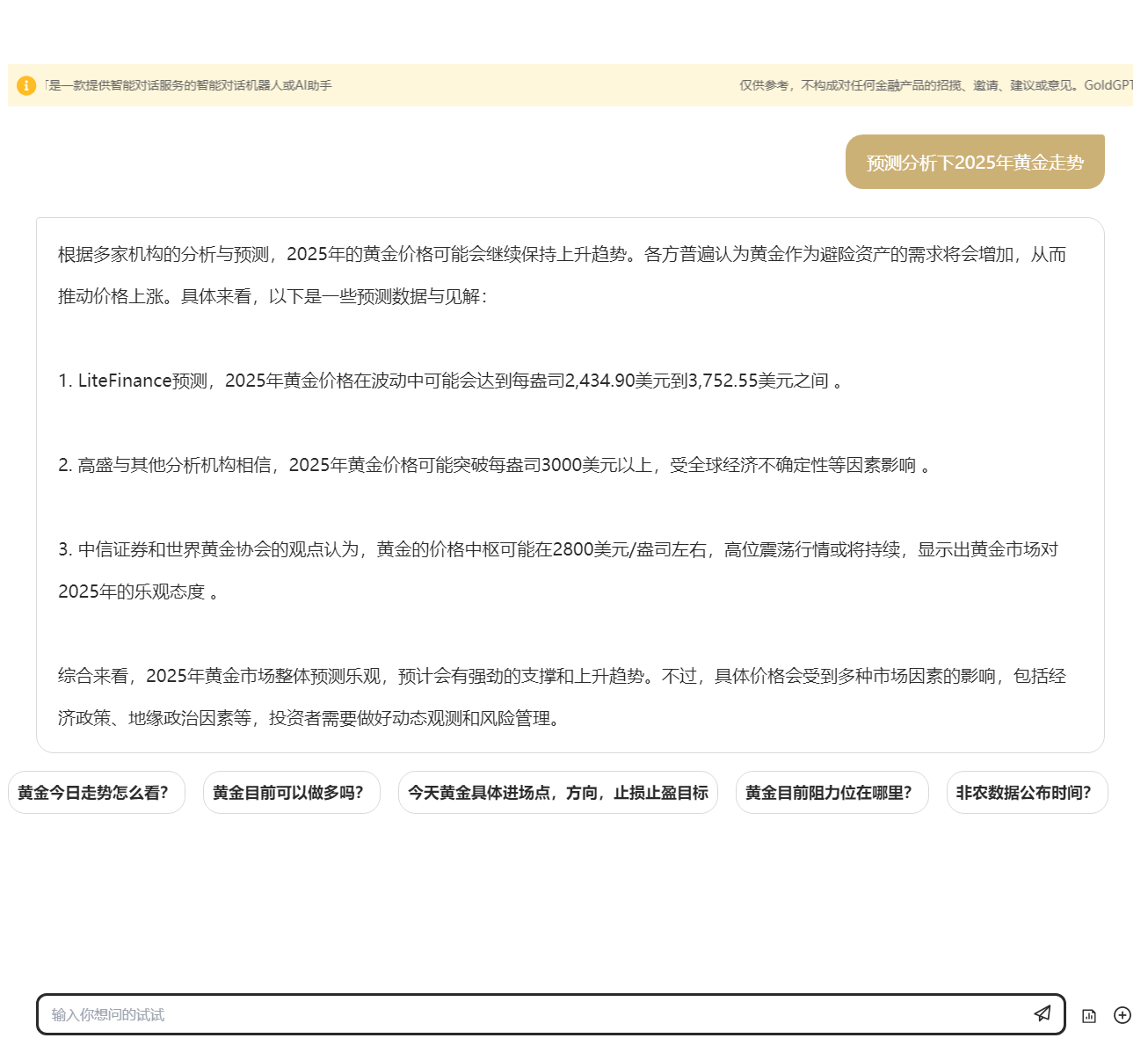 总体而言,对2025年黄金市场的前景持积极态度,预计将获得坚实的支撑并呈现上升势头。然而,黄金的具体价格会受到包括经济政策和地缘政治等多重市场因素的干扰,投资者需进行持续的市场观察和风险控制。投资者可以随时向GoldGPT寻求咨询,它将为您的理财之旅提供安全保障。