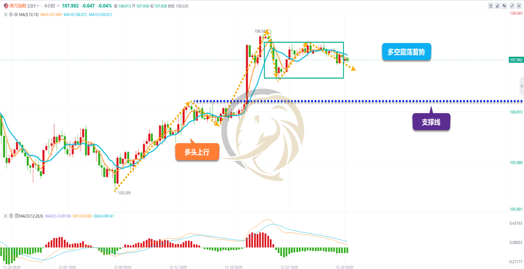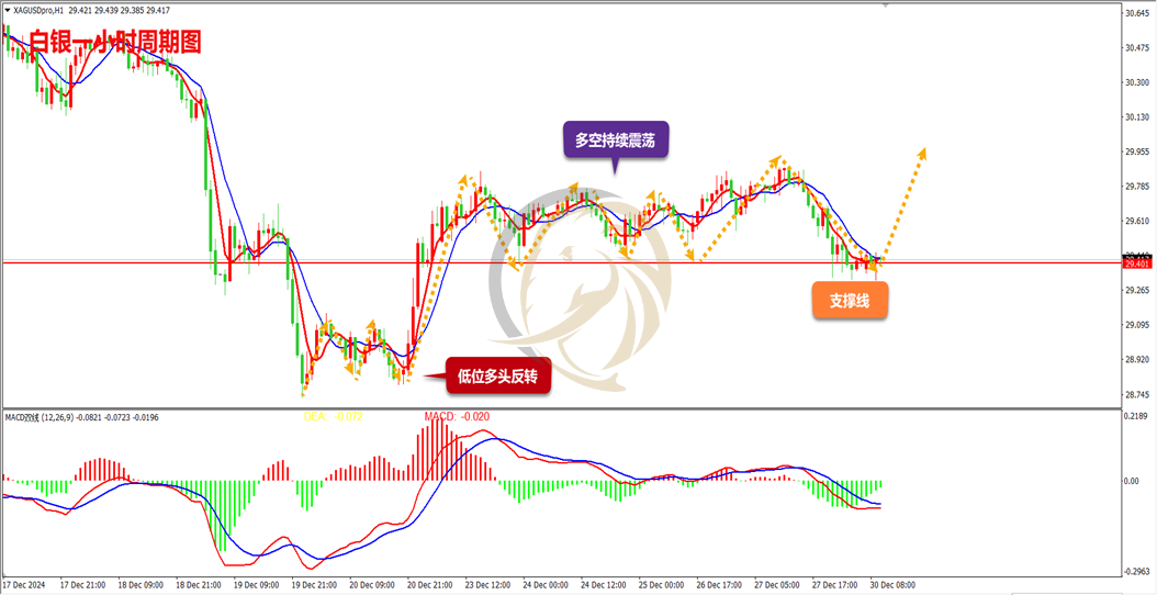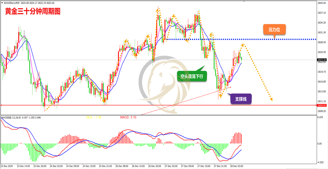 上周五,现货黄金多头持续反弹,最终多头无力出现大幅回落。市场经历圣诞假期后,多空表现的不太积极,受避险情绪影响多头出现较为有力的一面,但因美国公债收益率上升,在假期稀少的交投中削弱了黄金的吸引力,使得金价承压下行。此外市场对于当选总统特朗普的回归也非常重视,特别是他的通胀刺激对于2025年美联储1前景影响较大,因此进入1月份要留意新的政策导致美联储货币政策前景生变。