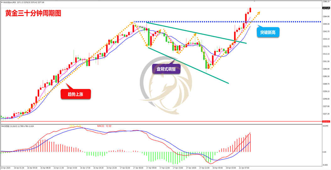 日内,受市场避险情绪的再次增加,现货黄金多头早间开盘,快速拉升再登新高峰。因美国总统特朗普照在社交平台上表示,“谈判与成功的黄金法则:拥有黄金者制定规则”,此举让现货黄金让次受到投资者极大的追捧。虽然市场经历复活节假期后,多空情绪进入平淡中,但此内容使得周一早间金价多头情绪又火速重燃。外加在关税问题上,特朗普批评关税的商人不擅长商业,但真正不擅长的是政治。同时其列举了8项非关税“作弊”手段,并点名日本和欧盟。不过关于关税引发的问题还在发酵,而美媒称近期全美爆发超700场抗议,反对美国政府大规模解雇联邦雇员、裁撤机构,驱逐移民等政策。