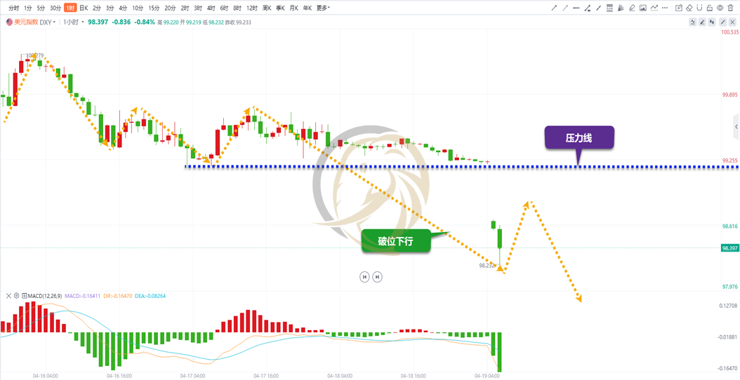 美元指数一小时周期图上,上周多空下破三角形震荡区间后,多空继续震荡下行,日内早间受周末消息影响,空头跳空下行。从走势上看,下跌趋势还在保持,空头再次继续下破新低,意味着持续来的多空震荡最终多头失守100关口,后续要留意新低的继续产生。