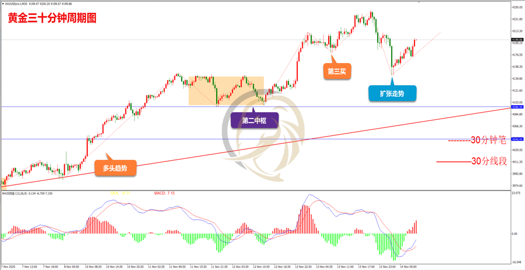 从指标上看,30分钟周期图MACD指标快慢线DIFF和DEA在0轴附近运行,红色动能柱还在生长,多头反击正在进行中,操作上建议做多的思路进行操作。