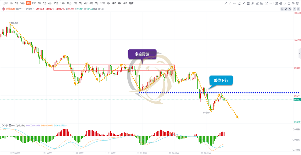 美元指数一小时周期图上,昨日空头继续破位下行,并二次创出新的低点,其后空头出现反弹。