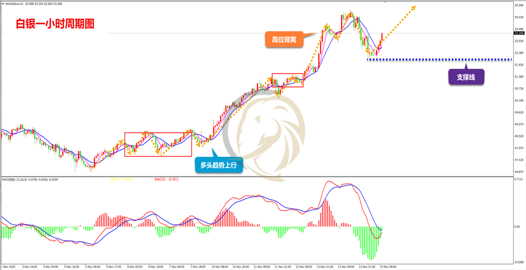 昨日,白银多头继续强力上行,早间短暂回落后多头最高上涨至54.380附近,其后高位快速回落,早间多头继续上行。
