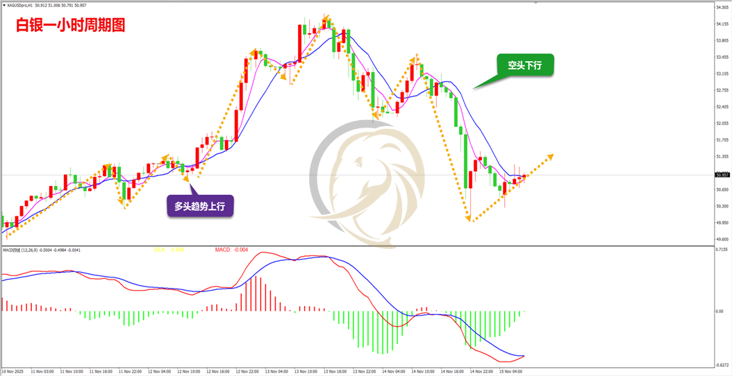 上周五,白银多头经历空头回落后,多头继续强力上行,但最高上涨至53.540附近出现受阻,其后空头大幅下行,早间多空维持低位震荡。从走势上看,经历空头大幅下跌后,50.200一带有止跌信号,多空还在低位震荡中,要留意多头经历大跌后的反击。从指标上看,一小时MACD指标快慢线DIFF和DEA在0轴下方即将金叉运行,绿色动能柱连续缩短,多头正在发力中,操作上建议做多的思路进行操作。