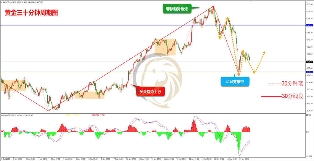 上周五,黄金多头继续冲高失败后,多空进入震荡局面,晚间美盘前突发破位大跳水,空头出现闪崩现象。从走势上看,多头上行趋势经历三买后,由于形成扩张走势,大涨大跌非常容易出现,但大跌后目前出现止跌于4046一带,本周要留意多空争夺此处。从指标上看,30分钟周期图MACD指标快慢线DIFF和DEA在0轴下方运行,红色动能柱正在缩短,多空在4046附近来回震荡,操作上建议低位做多的思路进行操作。