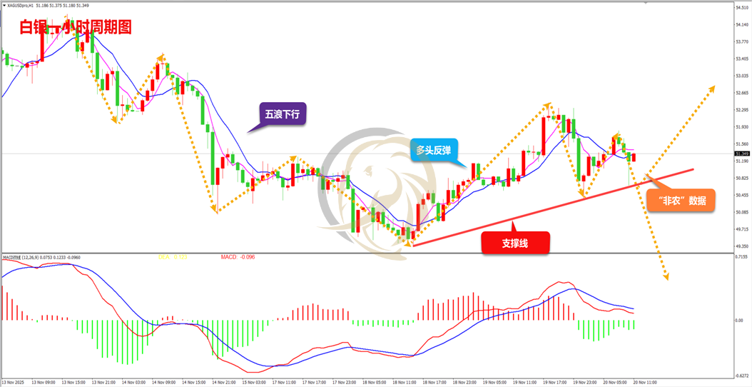 昨日,白银多头继续拉升上行,多头最高上涨至52.450附近受阻,其后空头开始回落,早间多空继续博弈陷入僵持阶段。从走势上看,由于晚间非农数据将公布,多空进入震荡态势,但从空头回落来看,下方出现长下影线,表明多头支撑较强,多头有继续发力上行的可能。从指标上看,一小时MACD指标快慢线DIFF和DEA正在回抽0轴附近,绿色动能柱正在缩短,多头有继续上行的可能,操作上建议做多的思路进行操作。