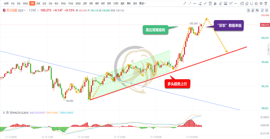 美元指数一小时周期图上,昨日多头继续大幅拉升,并一举突破100关口,走势再次进入超强态势。从上升趋势结构来看,多头强力拉升后,高位出现背离结构,日内要留意高位调整出现,同时晚间非农数据出现后,可能会给走势带来较大波动,要留意大起大落的出现。