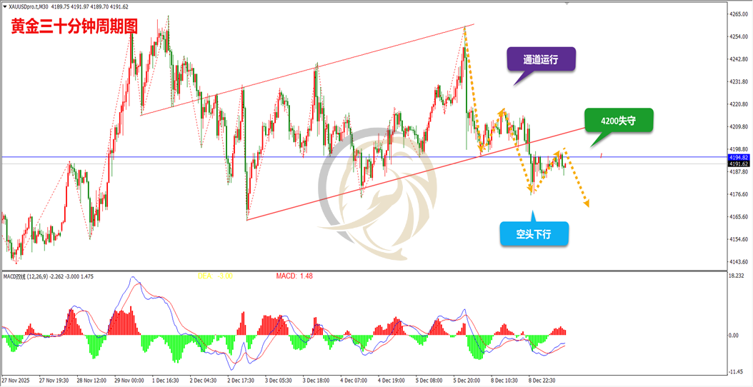 昨日,黄金多空继续震荡回落,晚间美盘时段破位下行,空头失守4200关口,最低下跌至4176附近。从走势上看,空头下跌趋势已经形成,昨日破位后多头还在反弹,日内要留意反弹受阻后的再次下行,由于多空震荡复杂,要留意多空转向。从指标上看,30分钟周期图MACD指标快慢线DIFF和DEA在0轴下方金叉,红色动能柱开始生长,多头动能继续出现,操作上建议做多的思路进行操作。