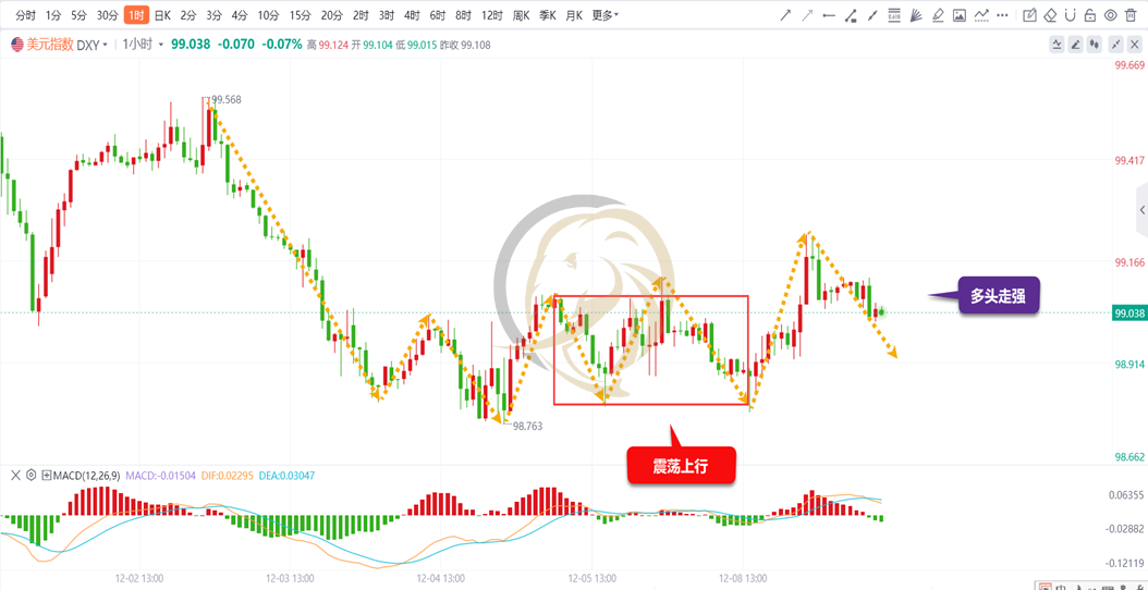 美元指数一小时周期图上,昨日空头再次回落未能新低,其后多头一举上涨创新高。从走势上看,多头上升结构正在形成中,日内要留意多头转势。从指标上看,MACD快慢线DIFF和DEA正在回抽0轴,绿色动能柱还在生长,调整还在继续,要留意调整结束后多头有再次发力的可能。