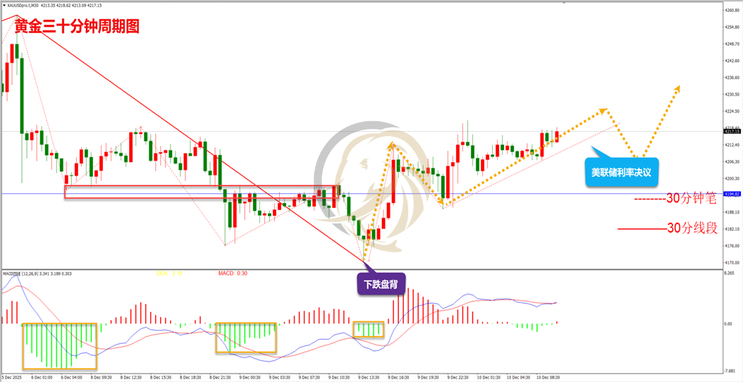 昨日,黄金空头继续震荡下行,空头最低下跌至4170附近受支撑,其后多头开始出现强力反弹。从走势上看,下跌趋势出现盘背后,多头反弹呈现N形结构,日内要留意是否出现转势的可能。从指标上看,30分钟周期图MACD指标快慢线DIFF和DEA在0轴上方死叉运行,空头有一定调整需求,由于多空还在博弈4200,操作上建议做多的思路进行操作。