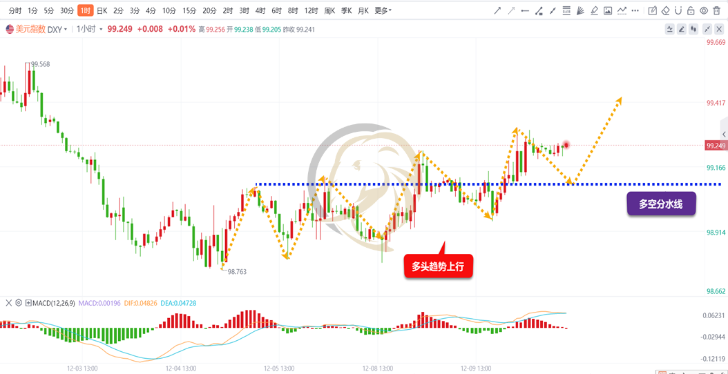 美元指数一小时周期图上,昨日空头再次回落至98.956止跌,其后多头强力上行,并再次创出新高。从走势结构上看,多头上升趋势已经形成,高点低点正在逐步抬升,随着美联储利率决议来临,多空有可能出现大幅波动,因此晚间要留意数据对走势带来的冲击。