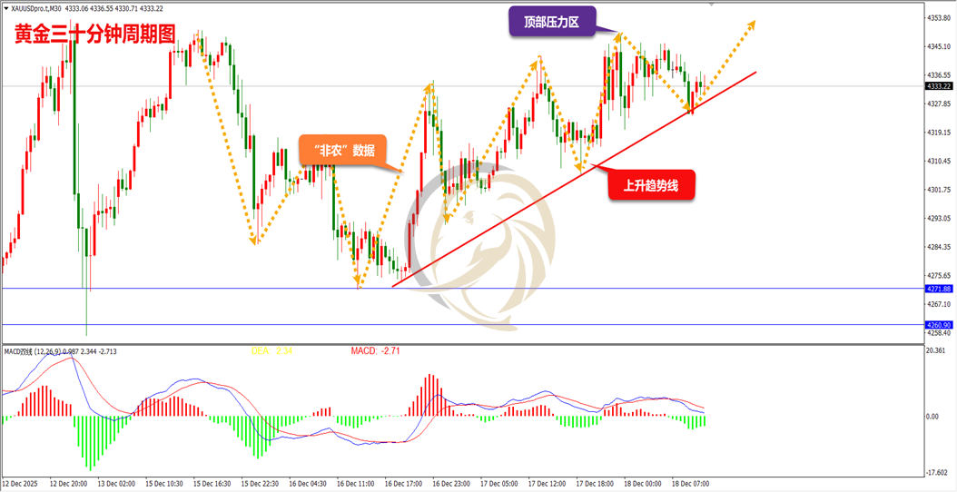 昨日,黄金多空继续震荡上行,最高上涨至4345附近多空开始加剧争夺,多头冲关之战迟迟未能打响。从走势上看,非农数据后多空上行结构正在延续,虽然还处在大型震荡区间内,但上升趋势的延续使得多头有冲顶的可能,日内要留意回抽后的继续上行。从指标上看,30分钟周期图MACD指标快慢线DIFF和DEA在回抽0轴附近,操作上建议回落做多的思路进行操作。