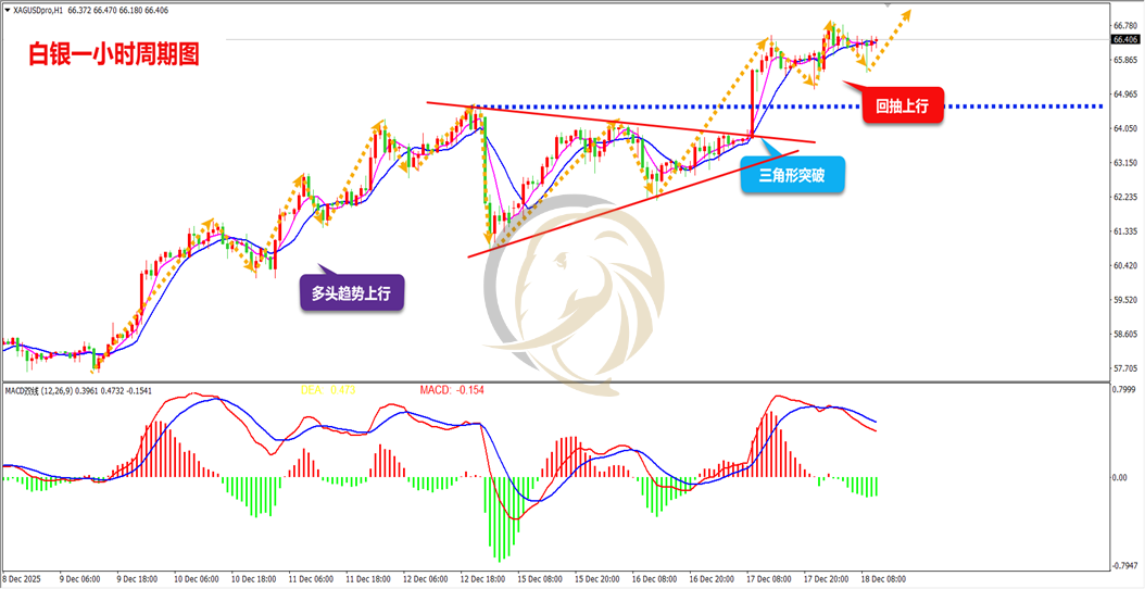 昨日,白银早间多头强力拉升,完成高位回踩后出现进一步上行,多头表现非常强势。从走势上看,多头上升趋势还在延续,多头快速突破三角形上轨后,强力拉升局面还在保持,早间短暂回落调整后还有继续新高的可能。从指标上看,一小时MACD指标快慢线DIFF和DEA在0轴上方死叉运行,绿色动能柱还在生长,由于多头处在强势期,操作上建议回落做多的思路进行操作。