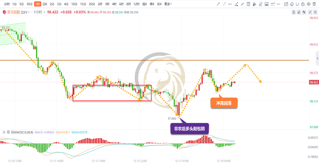 美元指数一小时周期图上,昨日多头延续反弹,最高突破下跌中枢上轨,整体反弹表现较为有力,其后出现回落调整。从走势上看,下跌出现背弛后,多头反击正在进行,要留意是否出现转势的现象,从指标上看,MACD快慢线DIFF及DEA在0轴上方即将金叉,多头有继续上行的可能。