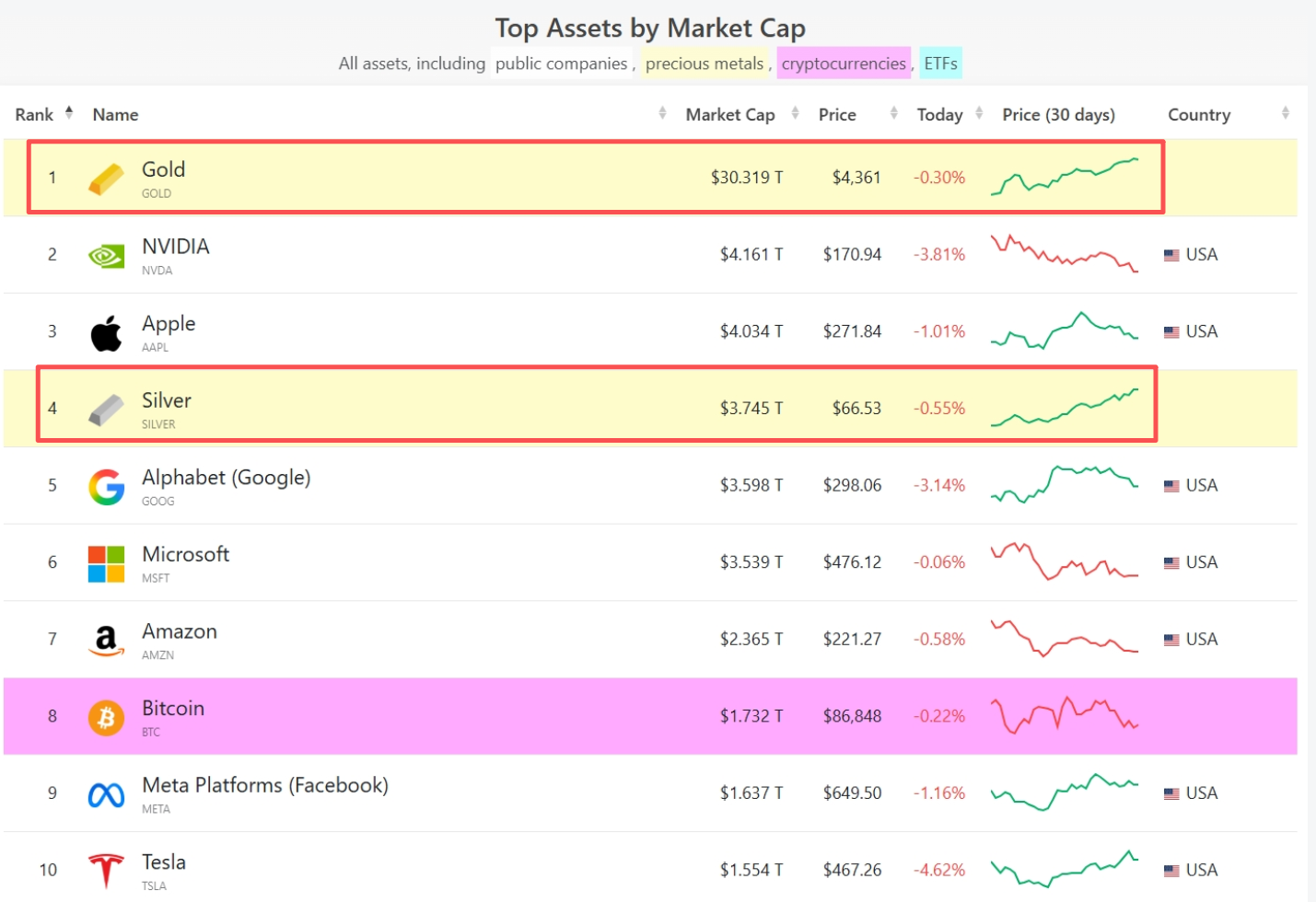 伴随最新一轮4%以上的价格上扬,白银市值首次超越谷歌母公司Alphabet,位列全球第四大资产,仅次于黄金、英伟达及苹果。