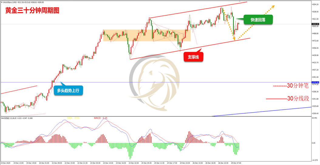 上周五,黄金多头继续震荡走高,其后高位出现回落调整,早间多头二次发力未能新高,调整出现幅度加大现象。从走势上看,多头上升趋势还在延续,早间快速回落正在回落至下方支撑线附近,其后多头展开上行,由于多头还在保持,多头集聚力量后还有冲高可能。从指标上看,30分钟周期图MACD指标快慢线DIFF和DEA在0轴附近即将金叉运行,绿色动能柱正在缩短,空头动能已很弱,操作上建议回落继续做多的思路进行操作。
