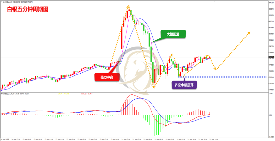 早间,白银多头强力拉升,多头表现非常强势,但短暂上行后,空头快速跳水,高位出现惊人的大幅洗盘行情,持续以来的多头热情暂时进入到混乱中。从走势上看,多头上升趋势还在保持,早间大幅回落后,多空将重新进入新的博弈中,各方动能要再次平衡后决定方向,因此要留意日内多空宽幅震荡的现象。从指标上看,五分钟MACD指标快慢线DIFF和DEA在0轴下方有即将死叉现象,红色动能柱正在缩短,由于当前多空处在宽幅震荡期,操作上建议回落接多的思路进行操作。