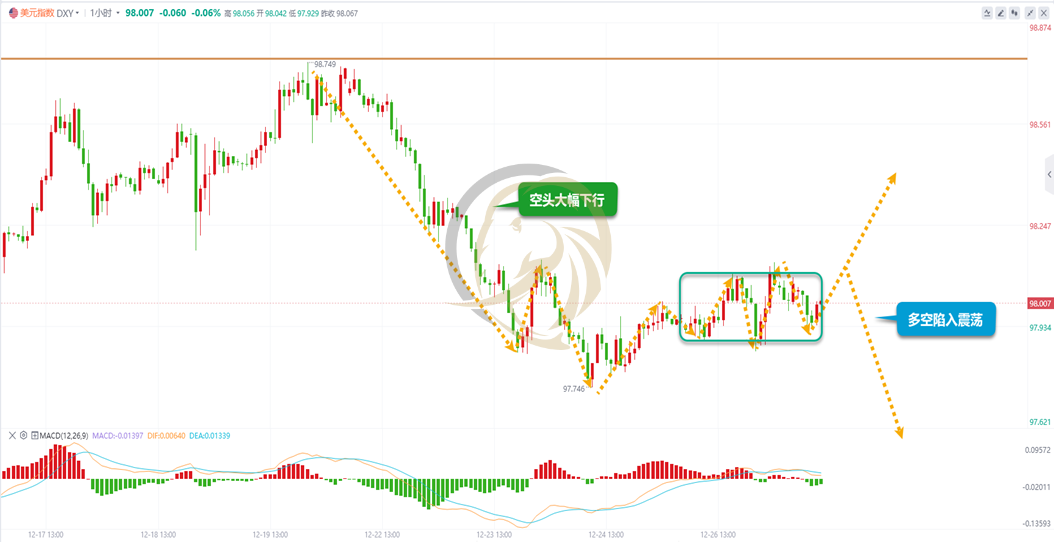 美元指数一小时周期图上,上周五多空反复震荡运行,整体处于多头反弹震荡期,日内早间力度表现较为温,预计多空震荡还将延续,全要留意走势结构是否出现转势的现象。从指标上看,MACD指标快慢线DIFF及DEA处在O轴上方运行,绿色动能柱还在生长,多头有继续向上的动能。