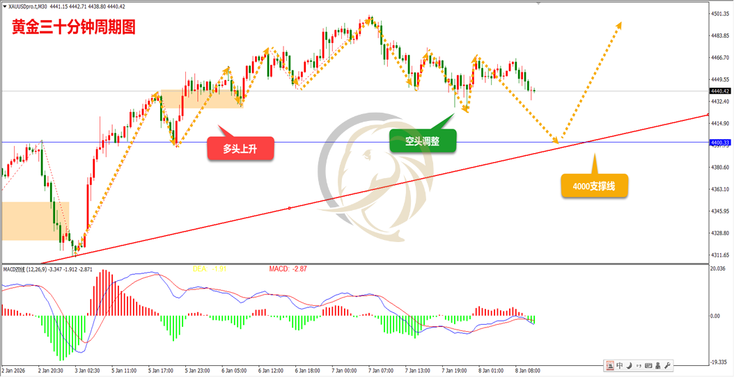 昨日,黄金逐步震荡走低,晚间美盘时段最低下跌至4423附近,多头受空头打压较重,日内早间依然下行中。从走势上看,多头上行趋势出现上涨无力后,空头展开震荡回落调整,当前下跌还在延续,由于下方4400还将有支撑,因此要留意空头继续测试此处。从指标上看,30分钟周期图MACD指标快慢线DIFF和DEA在0轴下方死叉运行,绿色动能柱逐步生长,空头调整还在进行,操作上建议破位做空的思路进行操作。