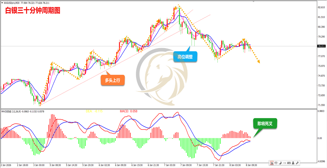 昨日,现货黄金市场多头力度不足,空头持续回落调整,盘中多头两次反弹均受挫,目前价格维持回落震荡中。从市场表现来看,受地缘政治局势影响多头继续拉升,但临近前期高位区间,多头上涨信心不足,有获利盘开始再现,因此本周能否继续上涨,还要留意周五公布的美国12月非农数据。隔夜公布的小非农数据意外疲软,给金价回落带来企稳的关键支撑,但多头反弹也较为短暂。