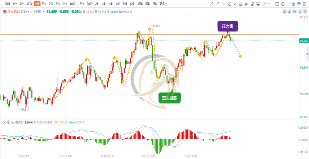 当前,黄金市场多空情绪复杂,一方面是地缘局势持续发酵带来的避险,另一方面美元指数短期内开始再次走强,在一定程度上承压金市。虽然美国劳动力市场出现降温迹象,但ISM服务业活动的意外回升,又给市场带来了不确定性,使得美元并未因美联储1降息预期而单边下跌。日内晚间将出炉美国12月挑战者企业裁员人数、美国截至1月3日当周初请失业金人数和美国12月纽约联储1年通胀预期2,这一系列经济数据的表现还将影响回落中的金价,因此投资者需要予以重关注,防止多头再次出现拉升。