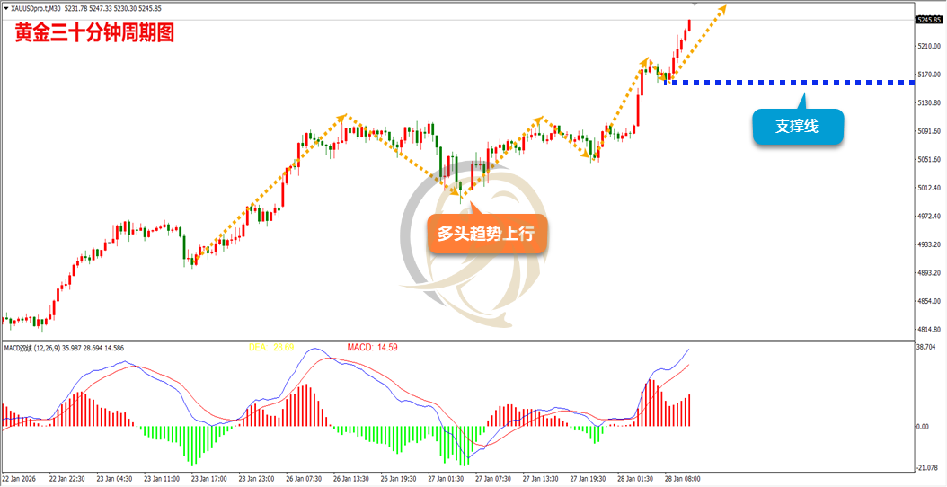 昨日,黄金经历空头回落调整后,于下方4990附近支撑位展开反击,其后多头开始继续震荡上行,晚间美盘时段未能新高,日内早间继续强力突破拉升。从走势上看,多头上行趋势还在保持,回落完成后多头继续上行,且突破新高力度极强。从指标上看,30分钟周期图MACD指标快慢线DIFF和DEA在0轴上方运行,红色动能柱还在生长,由于日内涨幅过大,操作上建议高位先尝试短空,其后回落后做多的思路进行操作。