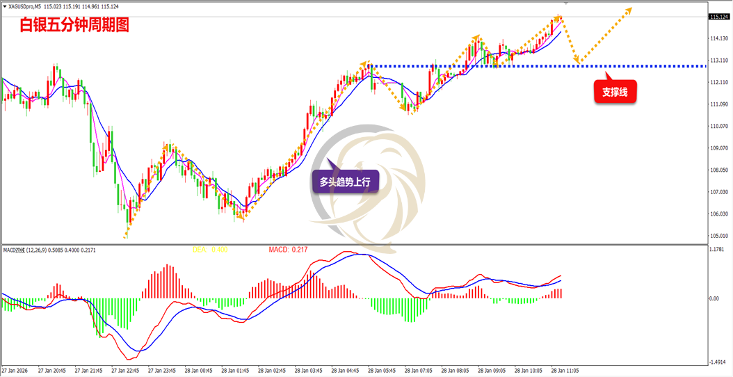 昨日,白银多头持续反弹受阻后,空头二次回落,最低回落至104.90附近出现支撑,其后多头再次上行。从走势上看,五分走势类型的多头上升趋势还在保持,但连续上行后出现动能不足的现象,日内要留意高位是否有回落出现。从指标上看,五分钟MACD指标快慢线DIFF和DEA正在回抽0轴附近死叉运行,绿色动能柱还在生长,操作上建议高位短空,其后做多的思路进行操作。