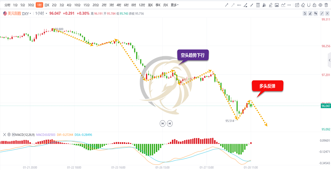 美元指数一小时周期图上,昨日开盘跳空低开后多头出现反弹,但反弹力度表现较弱,其后空头继续破位下行。从走势上看,下跌趋势还在延续,空头动能较强,日内反弹后要留意晚间美联储利率决议带来的影响,一旦再次回落要留意继续新低。